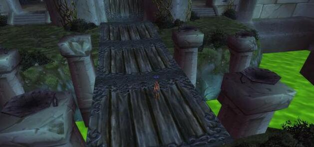 穿过广场之后是皇宫的护城河,现在流淌着被遗忘者的尸液。模型虽小,内容不少,还原成现实应该是个很大的城内广场。这座桥在阿尔萨斯弑父 的CG里能看到。过桥之后与皇宫之间还有一道城墙,走进城门之后是个显眼的废弃挂钟和两边的英雄雕塑。这挂钟在CG里还是吊在钟楼上的,发出了王国末日的哀鸣钟声。