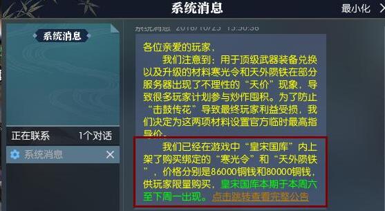 原后就有了游戏里的一纸通告,皇宋国库直接上架寒光令和天外陨铁。而且价格远远低于市场价,分别为86000铜钱和80000铜钱,这一波操作直接让今天还在囤货的傻眼了。但是皇宋国库活动要到星期六才开始,所以很多人依然等不急,虽然小有跌价,但是也不会亏太多。不过平民玩家完全不用跟风,如果自己攒不起材料,完全可以到星期六再国库里面买,这样还能省下一笔钱。xw20181001xunji