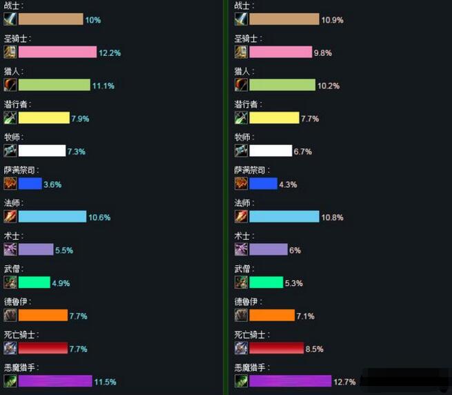 近战职业在魔兽世界中一直是强力的代名词,除了传统的战士、盗贼以外,魔兽世界这些年增加的三个新职业也都是近战,并且都是超强的存在,因此近战职业玩家数量也一直高于远程职业,随着魔兽世界越来越简化,这些职业的操作也越来越简单,比如战士曾经的姿态之舞可以按到手抽筋,现在就那几个技能,按照循环哪个亮按哪个就行了,所以在操作上对于新手来说没有太大的区别,然而在游戏体验和就业率方面,这些职业的区别还是很大的。