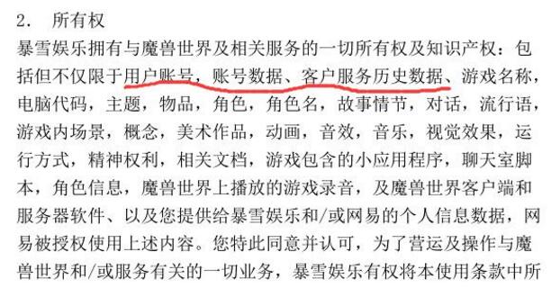 也就是说你在游戏中创建的人物角色,装备,货币等等一切内容,所有权其实并不归玩家本人所有,而是暴雪的虚拟财产,而网易又是暴雪在中国地区魔兽世界的运营加速器商,等于于暴雪把游戏内一部分对玩家账号的处分权授予了网易,但是别忘了你的账号其实是属于暴雪的。