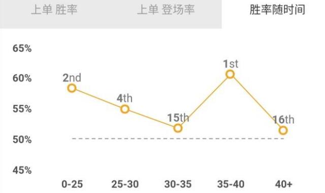 我们不谈奶妈的整体胜率,这里重点来说一说奶妈的时间点胜率,从图片中我们可以看到,上路奶妈在25分钟以内的胜率排在第二位,25到30分钟的时间里排在第四位。虽说在30分钟到35分钟的时候排名不是很高,原因就在于这个时候大家比拼的多是抓单gank或者说围绕野区的视野做文章,以至于奶奶就这种情况下很难发挥出其该有的特制,毕竟这个英雄并非是正统的上路坦克,她多是发挥保护能力,以至于在这个时候是奶妈的第一个疲软期。