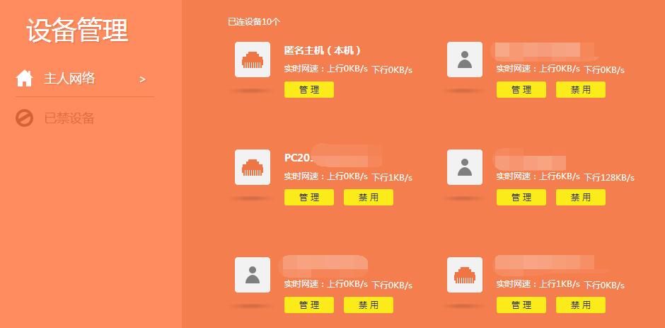 2. 在管理页面中找到“设备管理”,点击进入,在这里可以看到当前连接在路由器下的所有设备,点击管理按钮后会出现当前设备瞪鯬地址,MAC地址以及是有线PC还是无线终端等信息,根据提供的这些信息判断是否是想要限速的主机;