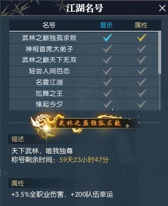 随着比武落幕,首席大弟子获得称号以及得到的Buff加成属性,亮瞎我们的双眼!这个称号走出去,比较“一醉轻王候”拉风多啦!还有独孤求败!这几个字多牛逼啊!全职业+3.5%的加成,真不是虚的。满满的真货啊!想想一个人秒伤1万,就能增强350,等于多出1大件啊!当然我是猜测,还要获得称号的大神给我们说说这个3.5%得历害!再来看看天下无双的属性。