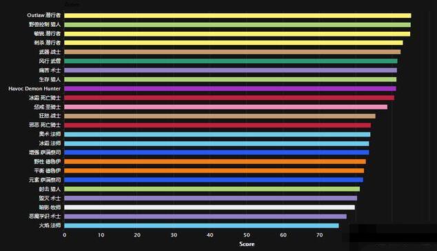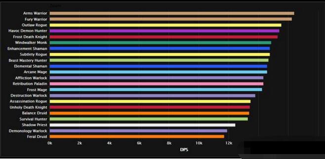 上图是奥迪尔副本总体DPS排行,可以看到盗贼三系登顶,从7.0版本的野外一刀贼,到现在的副本三系登顶,暴雪亲儿子到底是谁,已经不言而喻了,再看看曾经的亲儿子法爷,已经到了垫底的地步。另外兽王猎在这个版本不论PVP还是PVE都太过于强势了,按照暴雪的习惯,距离被砍已经不远了。之前加强了AOE的野德,依然是副本中垫底的存在。